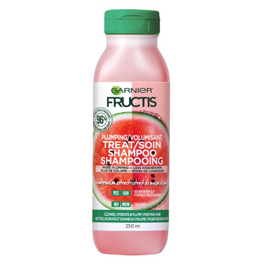 Discover Fructis Watermelon Hair Treats Shampoo by Garnier, made with 96% naturally-derived ingredients, enriched with plumping watermelon extract, this range is perfect to boost your fine hair with nutrients and moisture for deeply plumped, healthy looking hair!