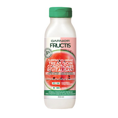 Discover Fructis Watermelon Hair Treats Conditioner by Garnier, made with 97% naturally-derived ingredients, enriched with plumping watermelon extract, this range is perfect to boost your fine hair with nutrients and moisture for deeply plumped, healthy looking hair!
