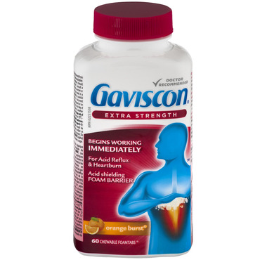 Gaviscon Extra Strength Chewable Foamtabs begin working immediately. Provides day & night-time relief of heartburn, acid reflux and GERD (Gastro-Esophageal Reflux Disease) symptoms. Doctor recommended Gaviscon forms a protective foam barrier that blocks acid reflux for hours. Free from aluminium, lactose & gluten.