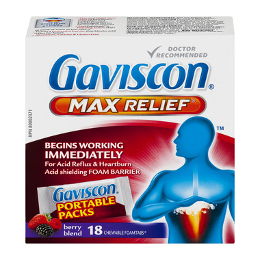 Gaviscon Max Relief Portable Pack Chewable Foam tabs begin working immediately. Provides day & night-time relief of heartburn, acid reflux and GERD (Gastro-Esophageal Reflux Disease) symptoms. Doctor recommended Gaviscon forms a protective foam barrier that blocks acid reflux for hours. Convenient single-dose portable packs. Free from aluminum, lactose & gluten.