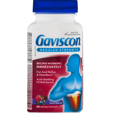 Gaviscon Regular Strength Chewable Foamtabs begin working immediately. Provides day & night-time relief of heartburn, acid reflux and GERD (Gastro-Esophageal Reflux Disease) symptoms. Doctor recommended Gaviscon forms a protective foam barrier that blocks acid reflux for hours. Free from aluminium, lactose & gluten.
