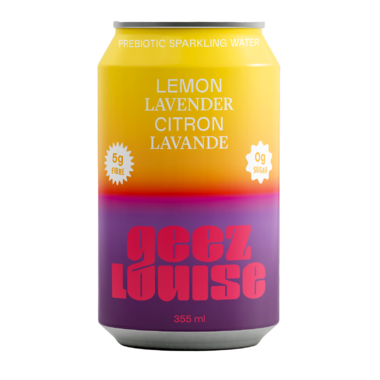 Geez Louise Lemon Lavender Prebiotic Sparkling Water Vibrant lemon mingles with the floral notes of lavender. A playful duet in your mouth. Balanced. Refreshing. Unexpectedly whimsical Geez Louise isn't just another fizzy drink. It's the ultimate gut-happy sparkling water with 5g of fibre, zero sugar, and no sweeteners. Made In Canada.