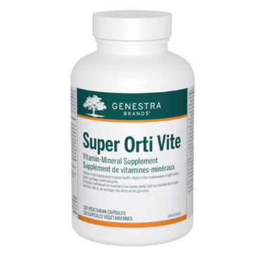 Super Orti Vite is a multi-vitamin/mineral supplement that provides bromelain and papain, plant-based enzymes from pineapple and papaya respectively. Supplementation with these digestive enzymes can aid in the breakdown of fats, carbohydrates and proteins. Bromelain is effective at a wide pH range, and remains active in both the stomach and small intestine.1 It has an especially strong ability to break down protein, and functions effectively during deficiencies in pepsin and/or trypsin.1 Vitamin D promotes calcium and phosphorus absorption in the intestine and regulates their levels in the blood and kidney for normal bone mineralization. Vitamin A helps stimulate the development of immune cells and is necessary for the production of rhodopsin, a pigment involved in sensing light. It also provides vitamins C and E, the most important antioxidants in aqueous and lipid compartments of the body. Selenium is also involved in the antioxidant defence system, as it is required for the production of proteins and enzymes that prevent free radical damage to DNA. Super Orti Vite provides support for good health with its comprehensive vitamin and mineral formula, plus the benefit of added digestive enzymes.