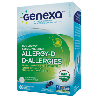 Genexa Allergy-D is a Homeopathic medicine for the temporary relief of symptoms of hay fever and other respiratory allergies, such as itchy watery eyes, nasal congestion, runny nose, sneezing, and itchy throat and nose.