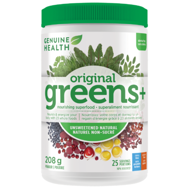 Getting a full spectrum of essential and diverse nutrients can be difficult through your diet alone and buying a whole variety of fruits & vegetables every week is overwhelming and expensive. Greens+ Original is designed with 40% more essential and full-spectrum phytonutrients than leading competitors, in 1 convenient daily serving, so you can cover all your nutritional needs with Canada's first and only research-proven superfood formula. Each serving provides targeted natural benefits to support your healthy lifestyle, aging process, immune health, energy and stress levels, and overall sense of well being with a synergistic blend of vitamins, minerals, antioxidants, adaptogens, as well as gut-loving probiotic cultures
