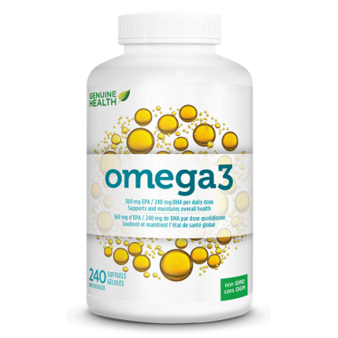 Genuine Health Omega3 Large Pack contains fish oils. Omega-3 fatty acids are integral to our health and well being – and are