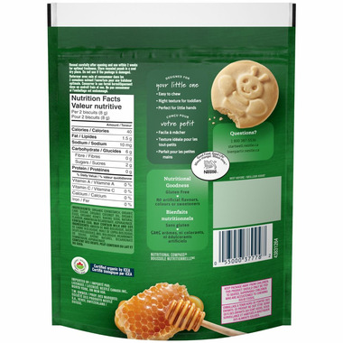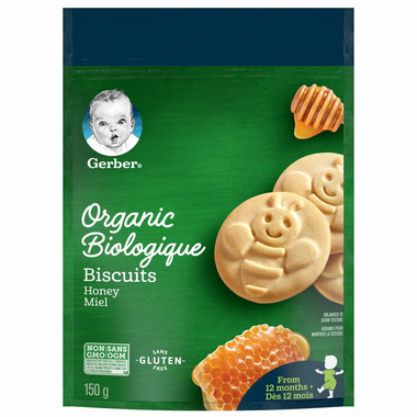 Introducing new GERBER Organic Biscuits, Honey Flavour (150 g), made for your little toddler. Even more, GERBER Organic Biscuits are the right texture for toddlers, are easy to chew, and are perfectly shaped and sized for little hands. For at home or on-the-go, honey flavoured gluten-free biscuits your growing little one will love!