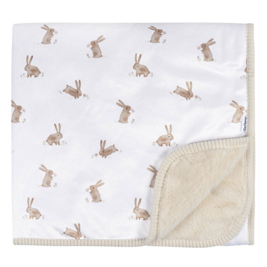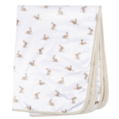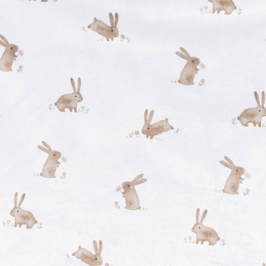 This adorable 2-ply baby blanket is an essential addition for your little one! Crafted from the softest materials, it's designed to ensure your baby remains snug and happy. The ample size makes it ideal for tummy time, playful moments, and beyond. Keeping it clean is a simple with machine washing, and it retains a soft feel even after regular cleaning. Decorated with a charming bunny pattern in a soothing tan and white color scheme, its both delightful and comforting for your little one.