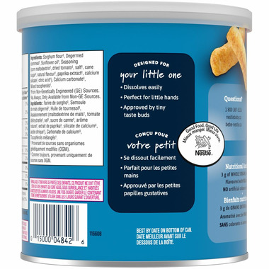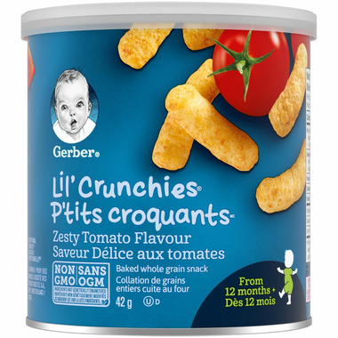 GERBER LIL’ CRUNCHIES, Zesty Tomato, Toddler Snacks (42 g) are made with your little toddler in mind. They are a baked whole grain snack, flavoured with real tomato and are approved by tiny taste buds! Our GERBER LIL’ CRUNCHIES dissolve easily, and are perfectly shaped and sized for little toddler hands! Gerber recipes are lovingly made with carefully selected, 100% wholesome ingredients.