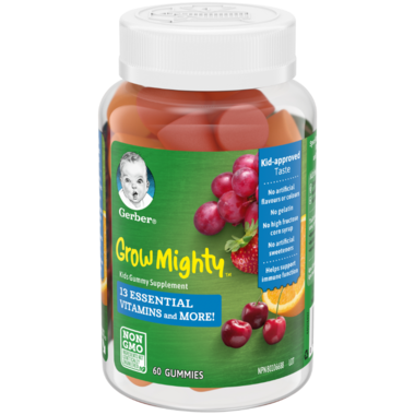 Gerber Grow Mighty Kids Gummies Supplement with more essential nutrients vs. the leading brand is uniquely made to support the growth and development of growing children ages 3 & up. Each serving contains 13 essential vitamins and more, including vitamins A, C, D and the full complement of B vitamins, that are tailored for your little one to support their immune function and to help them build strong bones and teeth. A kid-approved taste – our gummies are non-GMO, and contain no artificial flavours or colours, no gelatin, no high fructose corn syrup, and no artificial sweeteners. You can feel confident that these yummy gummies are made with quality ingredients to help support your little one's good health as they grow.