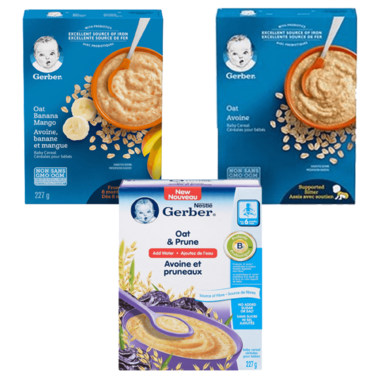 Gerber Baby Cereal Oat: Oat Flour, Dry Skim Milk, Canola Oil, High Oleic Sunflower Oil, Sunflower Oil, Bifidobacterium Lactis. Gerber Baby Cereal Oat & Prune 6 Months+: Oat flour (contains wheat), dry skim milk, dried prune flakes (prunes, conrstarch, sunflower lecithin), palm olein, canola oil, coconut oil, sunflower oil, maltodextrin, (corn, rice, ptoato or tapioca), bifidobacterium, lactis. Gerber Baby Cereal Oat Banana Mango: Oat Flour?, Dry Skim Milk?, Canola Oil?, Mango Crunchies (Corn Starch?, Mango Pur?e?), Canola Oil?, Dried Banana?, Bifidobacterium Lactis?, Natural Flavour. Vitamins and Iron: Thiamine Mononitrate?, Riboflavin?, Niacinamide?, Ferric Pyrophosphate?. ?From Non-Genetically Engineered (GE) Sources.