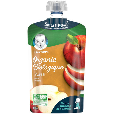 Introduce the little one to the goodness of fruits with GERBER Organic Puree, Apple, Baby Food (128 ml). Lets face it -nothing is ever 100% mess proof. That's why we've put the proprietary Smart Flow spout on all the GERBER Organic pouches. The Smart Flow spout helps get more food on that little spoon and less everywhere else, so mealtime should become a more nutritious, less messy experience. It also gives toddlers big control when theyْre learning to self-feed*.