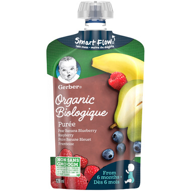 - GERBER Organic Purees, Pear Banana Blueberry Raspberry has no sugar or salt added