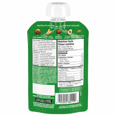 Organic Apple Pure, Organic Mango Pure, Water, Organic Raspberry Puree, Organic Whole Grain Oats, Organic Avocado Pure, Organic Lemon Juice Concentrate, Organic Lime Juice Concentrate, Ascorbic Acid.