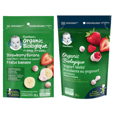 - Perfect Toddler Yogurt Snack GERBER Organic YOGURT MELTS are designed to be nutritious and delicious, made with real organic yogurt and fruit, with NO artificial flavours, colours or sweeteners