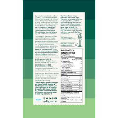 Giddy Yoyo radiation tested broken cell wall Chlorella (Chlorella Pyrenoidosa) is a cultivated single-celled fresh water grown green algae that contains high levels of chlorophyll ( the stuff that makes plants green). Chlorella is an easily digestible whole food that can be enjoyed in many ways and does NOT have a "fishy" taste. Their Chlorella is grown under strict controlled environments and does NOT contain fillers, binders, chemical solvents or heavy metals regularly used in food production.