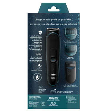 Meet Gillette's gentle and easy intimate shaving lineup that shows the proper respect for your region. Gillette Intimate Pubic Trimmer is Gillette’s first pubic hair trimmer for men, designed for gentle and easy grooming below the waist. This electric pubic trimmer is cordless and has SkinFirst™ technology with closely spaced blades to reduce skin bulging and help protect pubic skin. With three interchangeable skin shield guards for protection from nicks and cuts and precision in intimate areas. Powered by Braun, this electric men's pubic hair trimmer is equipped with a powerful Li-Ion rechargeable battery that lasts up to 100 minutes from a single charge. This waterproof pubic hair trimmer for men can be used wet or dry, so you can easily trim at the sink or in the shower, whenever you want, wherever you want. Transform your manscaping routine with Gillette's pubic hair trimmer. Gillette's intimate pubic trimmer comes with a charger and 3 lengths of interchangeable guards. With Gillette Intimate Grooming, you have a routine so simple and easy that you won't need to plan ahead.