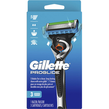 The Gillette ProGlide razor for men provides the iconic Gillette shave precision with comfort and style. This 5-bladed men's razor with FlexBall features a larger* lubrication strip for added comfort and glide to your shave. This enhanced Lubrastrip also fades when you are no longer getting an optimal shave. The handle’s FlexBall technology responds to your facial contours, and the blade cartridge features 5 anti-friction blades for a shave you can barely feel. Our simple yet effective blade stabilization maintains optimal blade spacing for comfort while allowing the blades to adjust to the contours of your face. The Precision Trimmer on the back is perfect for styling facial hair, especially in these hard-to-reach areas such as under the nose and the sideburns. With soft microfins that gently stretch and smooth your skin and a microcomb that helps guide your hair for a close shave from our thinnest blades. Our anti-friction razor blades ensure a smooth shave, fitting all Gillette 5-blade razor handles (excluding GilletteLabs). ProGlide refills can last up to 20 shaves. (*Vs. Fusion5)