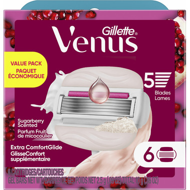 Venus female razor blades are designed with a woman’s body in mind. Venus ComfortGlide plus Olay women’s razors have 5 blades for a smooth, close shave that lasts. These razor refills come equipped with Olay Moisture Bars that release body butters with a light sugarberry fragrance, for glide and comfort. With a pivoting design that adjusts to your body’s contours. Any Venus blade refill fits any Venus razor handle (except Simply Venus and Venus Pubic Hair Razor).