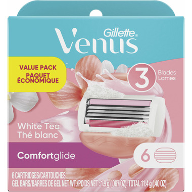 Venus ComfortGlide White Tea women’s razors have 3 blades for a smooth, close shave. The razor refills come equipped with gel bars that release body butters with a white tea fragrance, for glide and comfort. With a pivoting design that adjusts to your body’s contours. Any Venus blade refill fits any Venus razor handle (except Simply Venus and Venus Pubic Hair Razor).