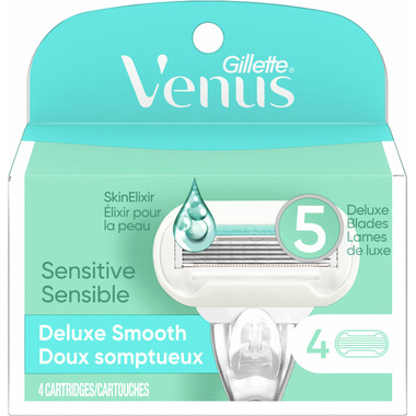 Venus Deluxe Smooth Sensitive women’s razors are perfect for protecting your sensitive skin. These razor refills feature 5 blades for a longer-lasting smooth shave and a SkinElixir lubrastrip for glide that releases a perfect dose of protection you can feel with up to 0% irritation (US Consumer Study Feb 2018). Any Venus blade refill fits any Venus razor handle (except Simply Venus and Venus Pubic Hair Razor).