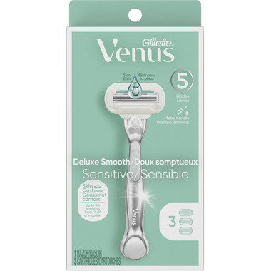 Venus female razor blades are designed with a woman’s body in mind. Venus Deluxe Smooth Sensitive women’s razors are perfect for protecting your sensitive skin. These razor refills feature 5 blades for a long-lasting smooth shave and SkinElixir that releases a perfect dose of protection you can feel. Any Venus blade refill fits any Venus razor handle (except Simply Venus and Venus Pubic Hair Razor).