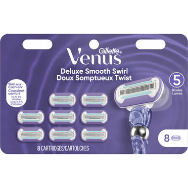 Venus female razor blades are designed with a woman’s body in mind. Venus Deluxe Smooth Swirl women’s razors bring smooth skin that lasts. These razor refills have 5 blades for a super close shave, and a water-activated ribbon of moisture which provides lubrication to guard your skin against nicks and cuts. These female razor blades cut hair closer to the skin, for a longer-lasting smooth.