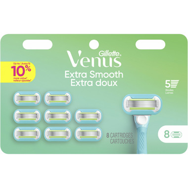 Venus female razors for women are designed with a woman’s body in mind. From handles designed for a comfortable grip to pivoting heads that contour to curves, Venus razors are designed to help reveal touchably smooth skin. Venus Extra Smooth women’s razors deliver a close, controlled shave. These razor refills have 5 diamond-like coated blades for an extra smooth shave that lasts. Each blade refill lasts up to one month (based on twice/week shave); just use and replace when you're ready for a new one. These female razor blades cut hair closer to the skin, for a longer-lasting smooth (vs Venus Smooth 3 bladed razor for women). The blade’s water-activated ribbon of moisture helps protect from nicks and cuts. These razor refills have a pivoting head that adjusts to your curves, including ankles and knees. No awkwardly angling your razor. Did you know that any Venus blade refill fits any Venus razor handle (except Simply Venus and Venus Pubic Hair Razor)? Shave your way without buying a whole new Venus handle.