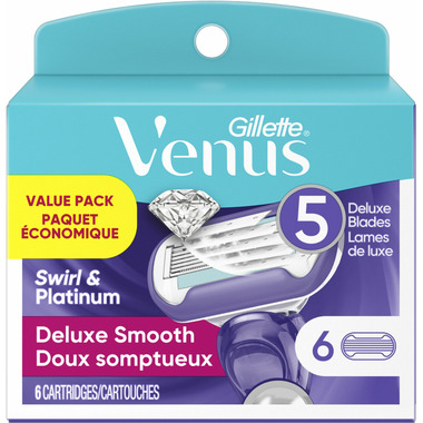 Venus female razor blades are designed with a woman’s body in mind. The Venus Deluxe Smooth Swirl women’s razor refills bring smooth skin that lasts. These razor refills have 5 durable blades for a super close shave, and a water activated ribbon of moisture which provides lubrication to guard your skin against nicks and cuts. These female razor blades cut hair closer to the skin, for a long-lasting smooth.  The individually adjusting contour blades helps capture what other razors may miss.  Each of this female razor's blades has a diamond-like coating to closely cut hair with ease, for extra smooth skin. Shave right, not more.  These razor blade refills also have a pivoting head that ensures shaving precision in hard to reach areas. No awkwardly angling your razor.  The MicroFine comb guides hair to the blades that capture virtually every hair.  Did you know that any Venus blade refill fits any Venus razor handle (except Simply Venus and Venus Pubic Hair Razor)? Shave your way without buying a whole new Venus handle.