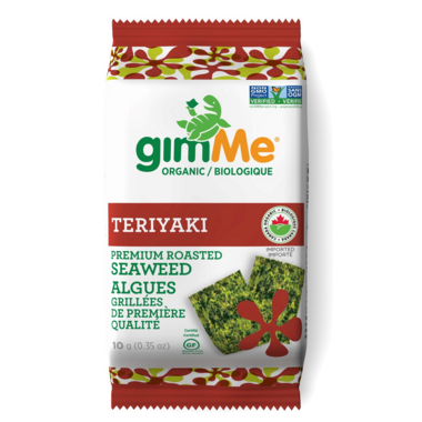 Ingredients: Organic Seaweed, Organic Sesame Oil, Organic Sunflower Oil, Organic Teriyaki Powder (Organic Tamari Soy Sauce [Organic Soybeans, Salt], Organic Maltodextrin, Organic Cane Sugar, Organic Onion, Organic Garlic).