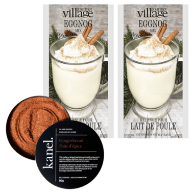 Kanel Spices Cocktail Rimmer Gingerbread Organic Golden Cane Sugar, Spices, Pure Vanilla Powder.Gourmet du Village Eggnog Mix Sugar, modified milk ingredients (whey protein concentrate, dairy product solids), corn syrup solids, coconut oil, sodium caseinate (milk), salt, dipotassium phosphate, mono and diglycerides, modified cellulose gum/guar gum, artificial flavor, silicon dioxide, color (fd&c yellow no. 5 aluminum lake. Allergen Info: Coconut, milk.
