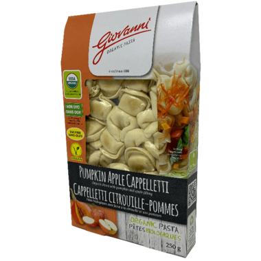 Giovanni Organic Pasta Pumpkin Apple cappelletti are organic pasta with pumpkin and apple filling made ready in 12-15 minutes!