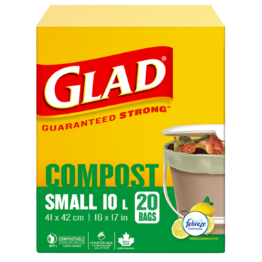 Glad 100% Compostable Fresh Lemon Scent bags keep your compost bin clean and your kitchen smelling fresh. OdourShield technology continuously neutralizes food odours and keeps your home smelling fresh with a pleasant lemon scent. Glad Compost bags meet the requirements of municipal compost programs, ASTM D6400 standards and are certified compostable by the industry standards authority, BPI and BNQ. Glad Compost Bags will compost completely, quickly, and safely in a municipal composting facility just like paper, yard trimmings, and food scraps. GLAD. Guaranteed Strong.