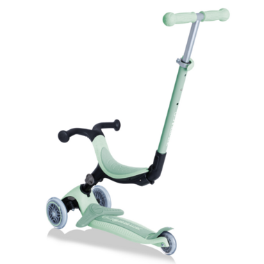 A 3-wheel eco scooter with seat for toddlers and kids that transforms into a ride-on (15-36M), walking bike (15-36M), and toddler scooter (3-7Y+), GO•UP FOLDABLE PLUS ECOLOGIC has the same structural integrity as the iconic original but uses more eco materials for less environmental impact.