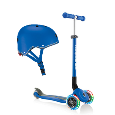 Globber Primo Foldable with Lights Navy Blue: Making innovative products accessible to all. PRIMO scooters offer a range of patented innovations without compromising on style or functionality, to deliver ultimate value for money. New wider composite deck design in dual colour with a nylon reinforced body frame supports up to 50kg. Safe, patented integrated folding system with a push button. Trolley mode compatible. Patented steering lock button fixes the steering system of the two front wheels to only move forward & backward.