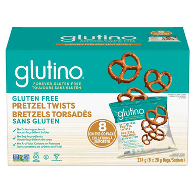 Glutino Pretzel Twist Snack Pack have no dairy or soy ingredients, and contain no artificial colours or flavours. Includes 8 on-the-go packs!