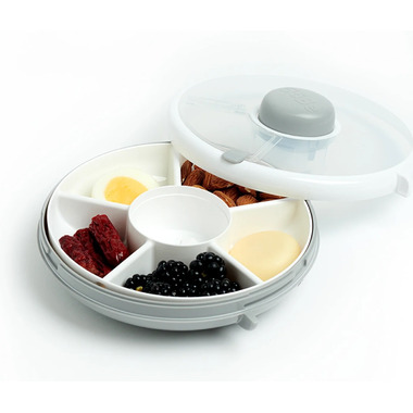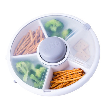 The Snack Spinner makes snacking on-the-go a breeze with five compartments, all in one container. The only dispenser with an interactive button to keep kids engaged as they choose which snack they want to eat!