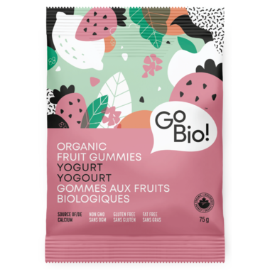 GoBio! Organic Fruit Gummies- Yogurt is made with low-fat dairy, fruit concentrates, and spices, including turmeric and spirulina. Sweetened with Beet Sugar. No Artificial Flavours, Preservatives, or Sweeteners.