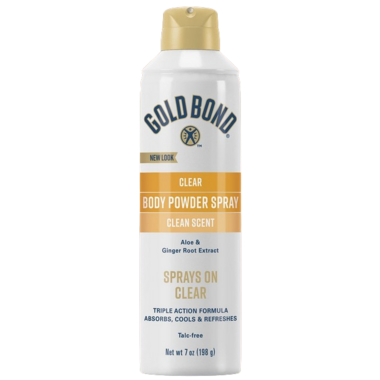 Whether at home, the office, or on the go, Gold Bond Clear Powder Spray delivers the soothing all-over odour* and wetness protection of Gold Bond Powder in a convenient spray. Formulated with aloe and ginger root extract, this talc-free triple action formula refreshes on contact, absorbs odour-causing sweat, and leaves your skin feeling clean and dry. Unlike traditional body powders, Gold Bond Clear Powder Spray goes on clear, leaving no white residue, so you can feel confident applying it whenever and wherever you need it.