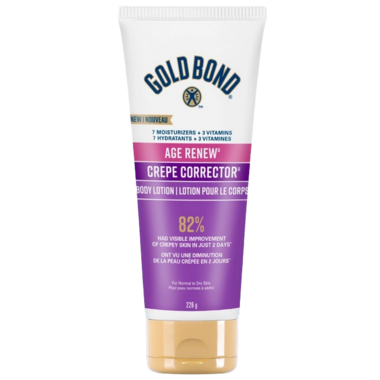 Visibly diminish the appearance of finely wrinkled, thin and dry crepey skin with Gold Bond Age Renew Crepe Corrector Body Lotion. This nourishing and smoothing body lotion features a unique blend of 7 moisturizers and 3 skin-firming vitamins that not only diminish the appearance of fine, thin wrinkles of aging, crepey skin, but also nourishes and replenishes the skin with penetrating, 24-hour hydration. Specially formulated with omega fatty acids, antioxidants, and botanicals, Age Renew Crepe Corrector's smoothing body lotion visibly firms and plumps dry, aging skin for a healthier, more youthful appearance. Plus, this unique smoothing lotion's blend has been clinically shown to improve the firmness and elasticity of crepey skin in two weeks, with 82% of users showing visible improvement in just 2 days*. Gold Bond Age Renew Crepe Corrector Body Lotion is suitable for all skin types. Best of all, it's hypoallergenic, fragrance-free, and dermatologist tested. Enjoy skin that looks as young as you feel with Gold Bond Age Renew Crepe Corrector lotion.
