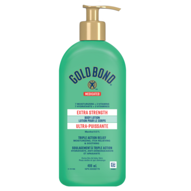 When you've got really itchy, dry, irritated or sunburned skin, you need the triple action relief of Gold Bond Medicated Extra Strength Medicated Body Lotion. It has five intensive moisturizers to protect and soothe irritated skin, while the powerful cooling sensation soothes the itch. Gold Bond Medicated Extra Strength Body Lotion goes way beyond ordinary body lotions because it is uniquely formulated to relieve the itch while moisturizing and soothing extra dry & irritated skin.