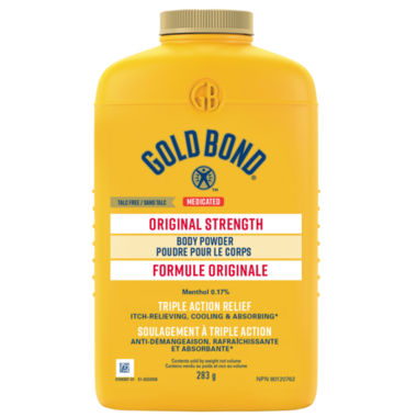 Trusted for generations, Gold Bond Medicated Original Strength Body Powder's triple action formula is a blend of two medically proven ingredients combined with the finest powder and essential oils. Our unique formula works hard to cool and soothe skin while absorbing excess moisture and stopping the itch. Gold Bond Body Powder is medicated to work hard, yet gentle enough to be used every day.