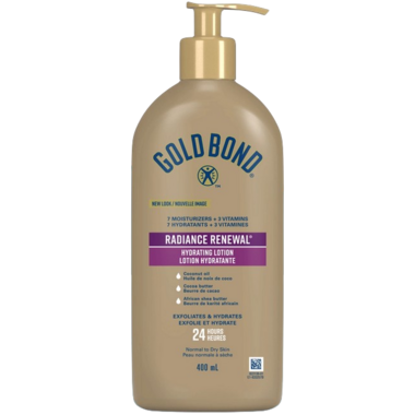 - Hydrating Lotion - Gold Bond Radiance Renewal Hydrating Lotion offers a triple nourishing blend of coconut oil, cocoa butter and African shea butter to provide extended 24-hour hydration; the 400ml pump bottle makes application easyGentle Exfoliants - Nourishing, exfoliating lotion that gently helps remove dead, dry skin cells that can cause skin to look flaky or ashy, leaving your skin looking healthy and radiant