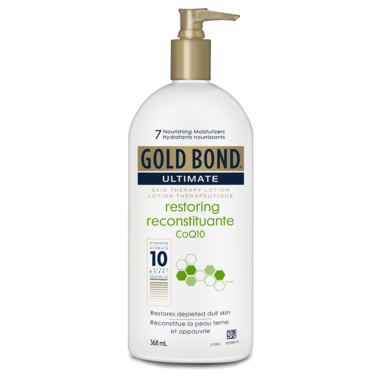 Gold Bond Ultimate Restoring is a lotion for daily use that helps restore depleted, dull skin. The formula has 7 nourishing moisturizers, combined with skin nurturing vitamins C and E plus CoQ10, the king of antioxidants. In addition, skin strengthening ceramides and lipids work to help restore elasticity, vitality and healthy skin texture. Always read and follow the label.
