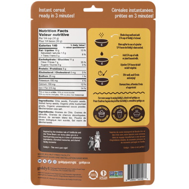 1. Pour Goldy's into a bowl or keep in the bag. 2. Add 1/4 cup of milk or milk substitute, or fill to line on bag. 3. Stir well, wait 3 minutes. Enjoy!