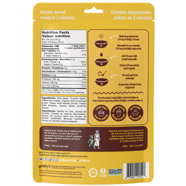 1. Pour Goldy's into a bowl or keep in the bag. 2. Add 1/4 cup of milk or milk substitute, or fill to line on bag. 3. Stir well, wait 3 minutes. Enjoy!