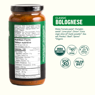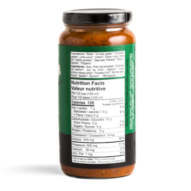 Ingredients: Water, Tomato paste*, Pumpkin seeds*, Lime juice*,Onion*, Extra virgin olive oil*, Garlic powder*, Sea salt, Parsley*, Basil*,Spices*. Organic *