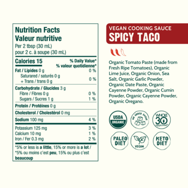 Ingredients: Organic Tomato Paste (made from Fresh Ripe Tomatoes), Organic Lime Juice, Organic Onion, Sea Salt, Organic Garlic Powder, Organic Date Paste, Organic Cayenne Powder, Organic Cumin Powder, Organic Cayenne Powder, Organic Oregano.