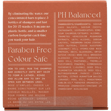 Sodium Coco Sulfate, Sodium Cocoyl Isethionate, Varisoft, Turkey Tail Mushroom Extract*, Cetyl Alcohol, Sodium Lactate, Cocoa Seed Butter*, Coconut Oil*, Hydrolyzed Rice Protein, Decyl Glucoside, Rice Bran Oil*, Broccoli Seed Oil*, Panthenol, Snow Mushroom Extract*, Jojoba Seed Oil*, Sacha Inchi Seed Oil*, Shea Butter*, Orange Essential Oil*, Patchouli Essential Oil* *Organically Produced Ingredient