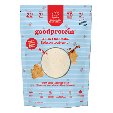 Protein blend (pea protein, milled golden flaxseed), Soluble tapioca fibers, Coconut milk powder* (coconut milk powder*, tapioca maltodextrin*, acacia gum*), Maple Sugar*, Natural flavours, Acacia gum, Guar gum, Xanthan gum, Medium chain triglycerides (medium chain triglycerides from coconut oil, acacia gum), Fruits, vegetables and mushrooms blend (broccoli, spinach, kale, pumpkin, sweet potato, sunflower seed, cranberry, chlorella, maitake mushroom, shiitake mushroom, pomegranate juice powder*, acai juice powder*, goji juice powder*, grape juice powder*, amla fruit powder*, aronia powder*, sea buckthorn juice powder*, camu camu powder*, acerola juice powder*), Rebaudioside M, Salt, Bacterial culture and enzymes blend (rice maltodextrin, Bacillus subtilis, amylase, protease).